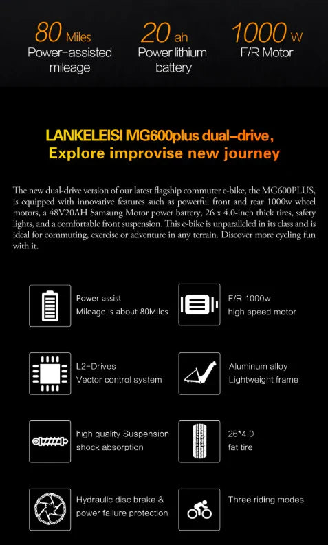 LANKELEISI MG600 Plus — Dual-Motor AWD Fat E-MTB (2×1000W), 48V 20Ah Samsung
